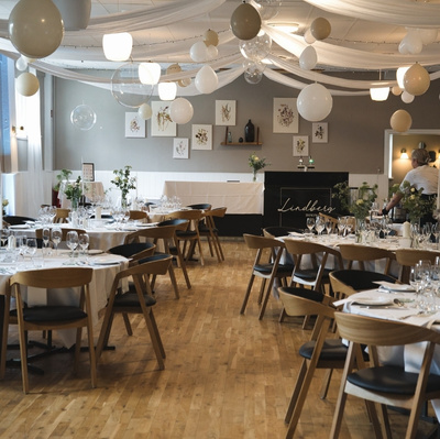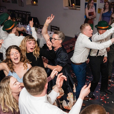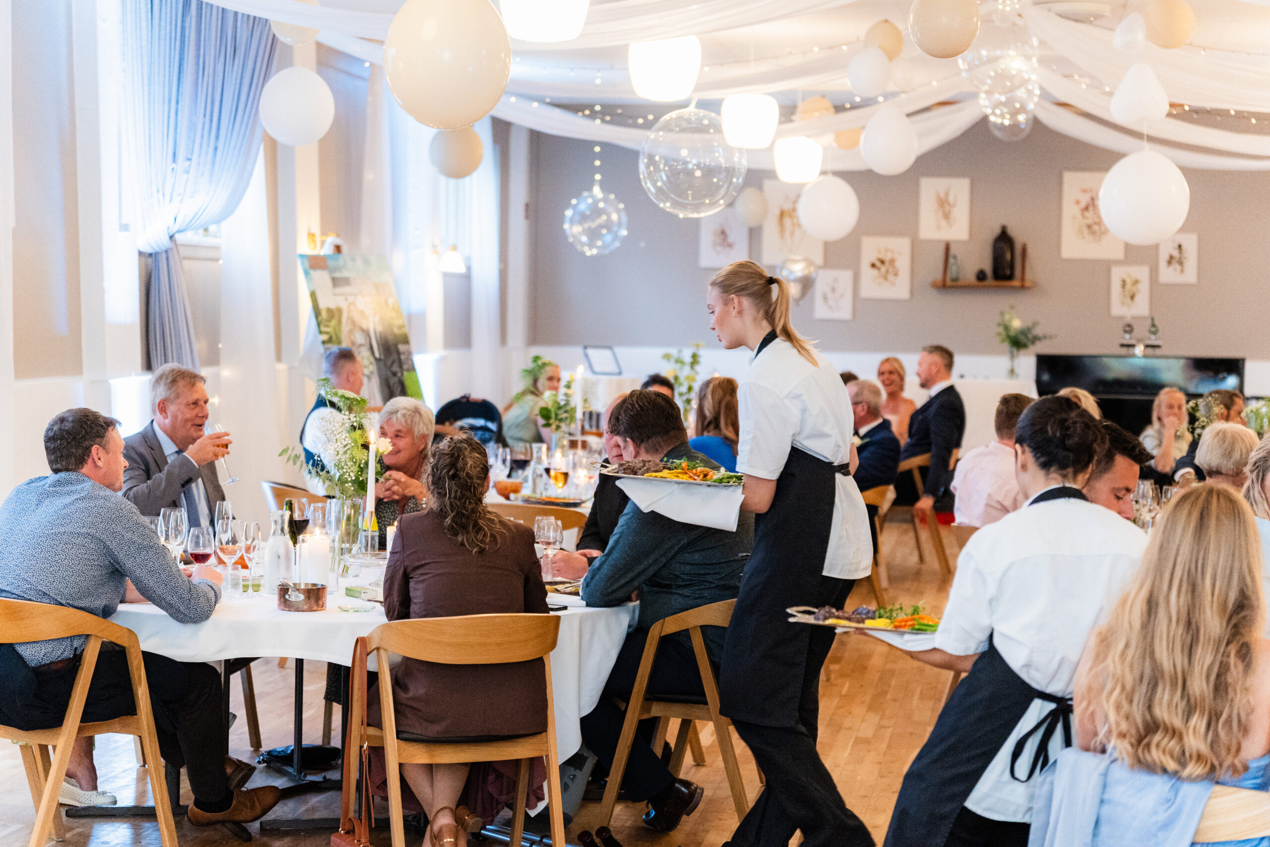 Stemningsbilleder fra festen med taler, indslag, brudevals og alt derimellem