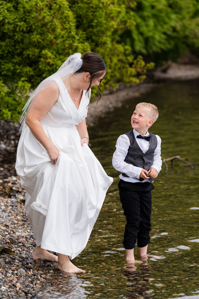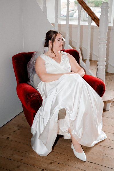Inden gæsterne samledes på slottet, tog jeg med brudeparret og deres to dejlige børn ned til stranden. Her skabte vi nogle af dagens mest stemningsfulde billeder – bare tæer i vandkanten, børn der grinede, og Line og Thomas, der ikke kunne skjule deres kærlighed til hinanden. Jeg elsker, når familier inddrager deres børn i portrætterne – det giver en helt særlig ægthed i billederne.