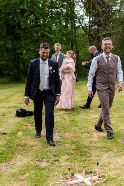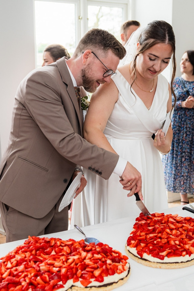 Tilbage på Hvolgård Gods summede haven af liv. Gæsterne hyggede sig med havelege og små snakke i de grønne kroge. Jeg bevægede mig imellem dem og fangede latterudbrud, smil og alle de små detaljer, som gør en bryllupsdag unik. På bordet stod den flotteste bryllupskage – formet som et hjerte og pyntet med friske jordbær – klar til at blive delt.